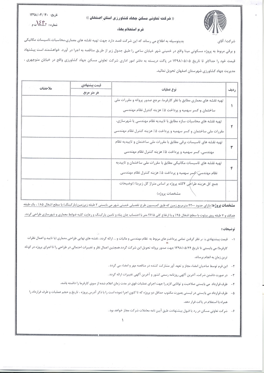 استعلام تهیه نقشه های معماری ، محاسبات ، تاسیسات مکانیکی و برقی پروژه مینا واقع در خمینی شهر