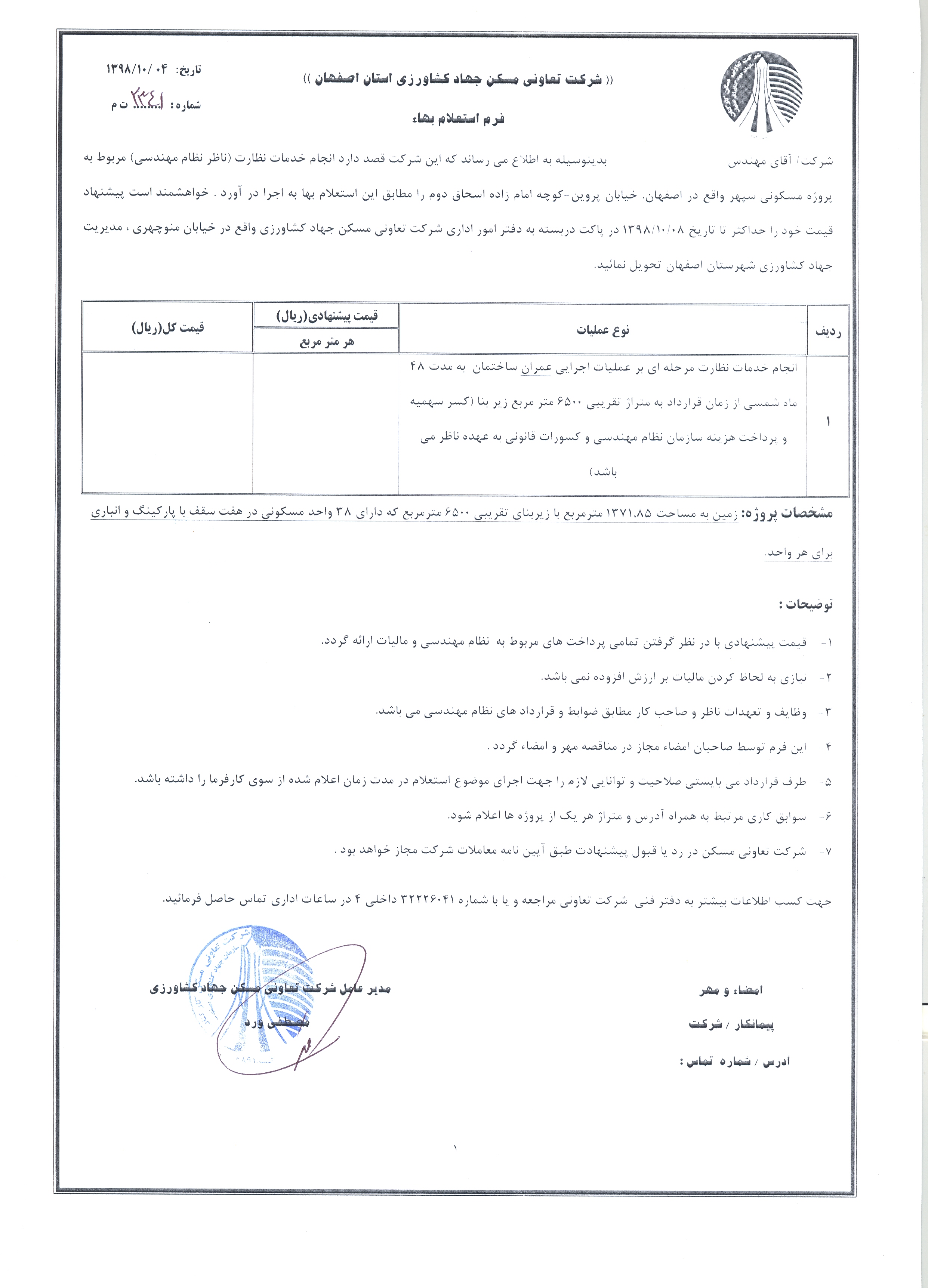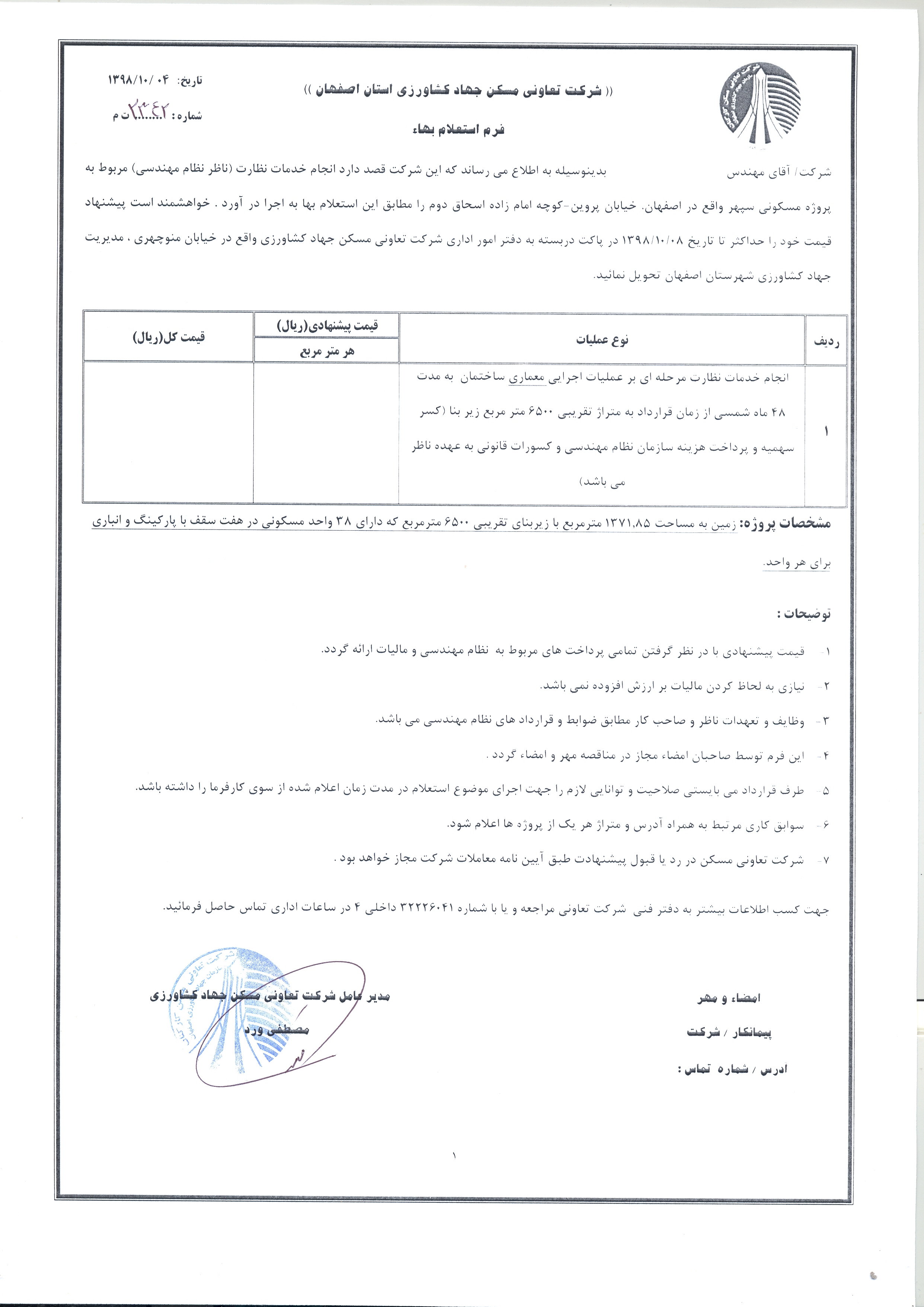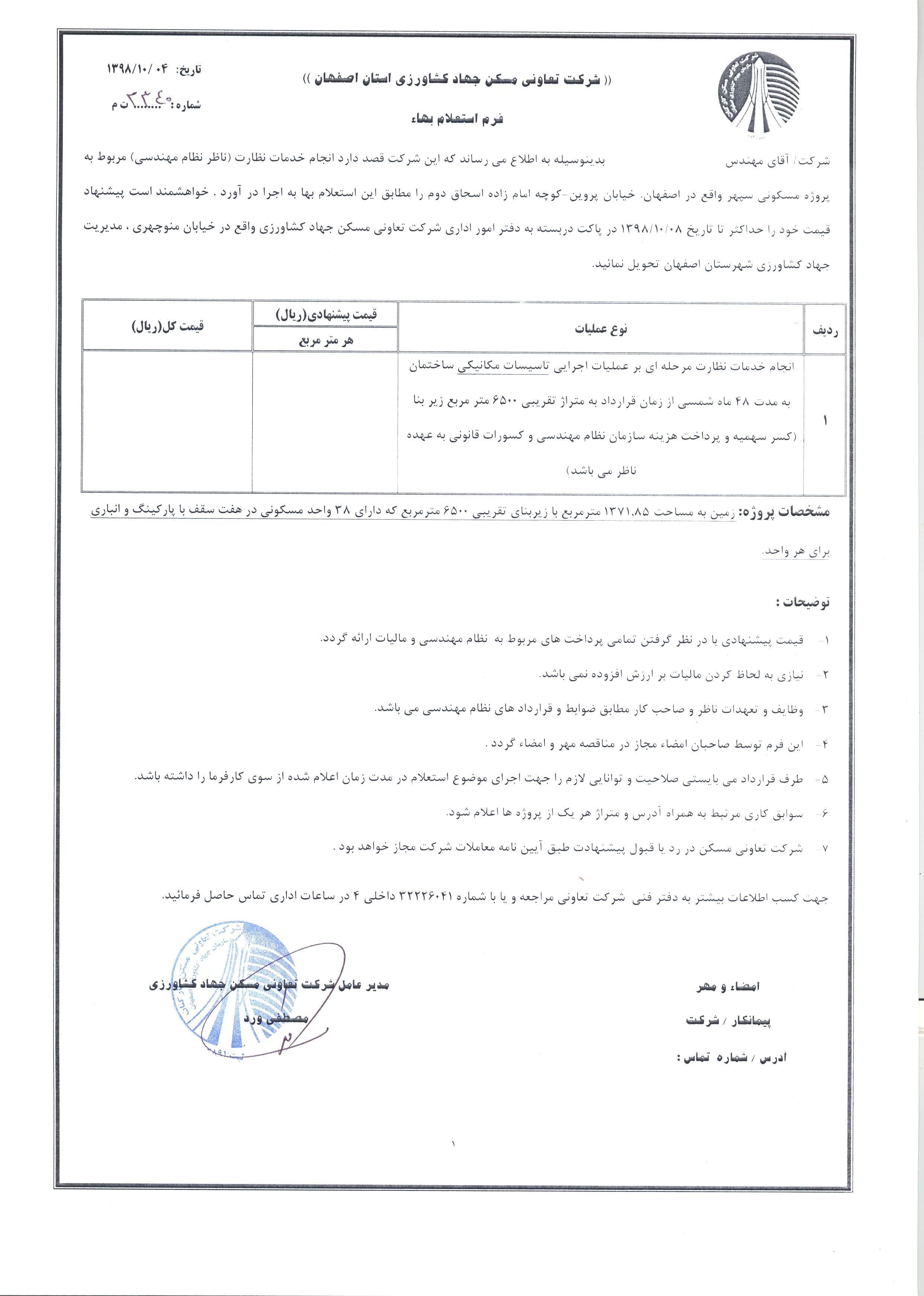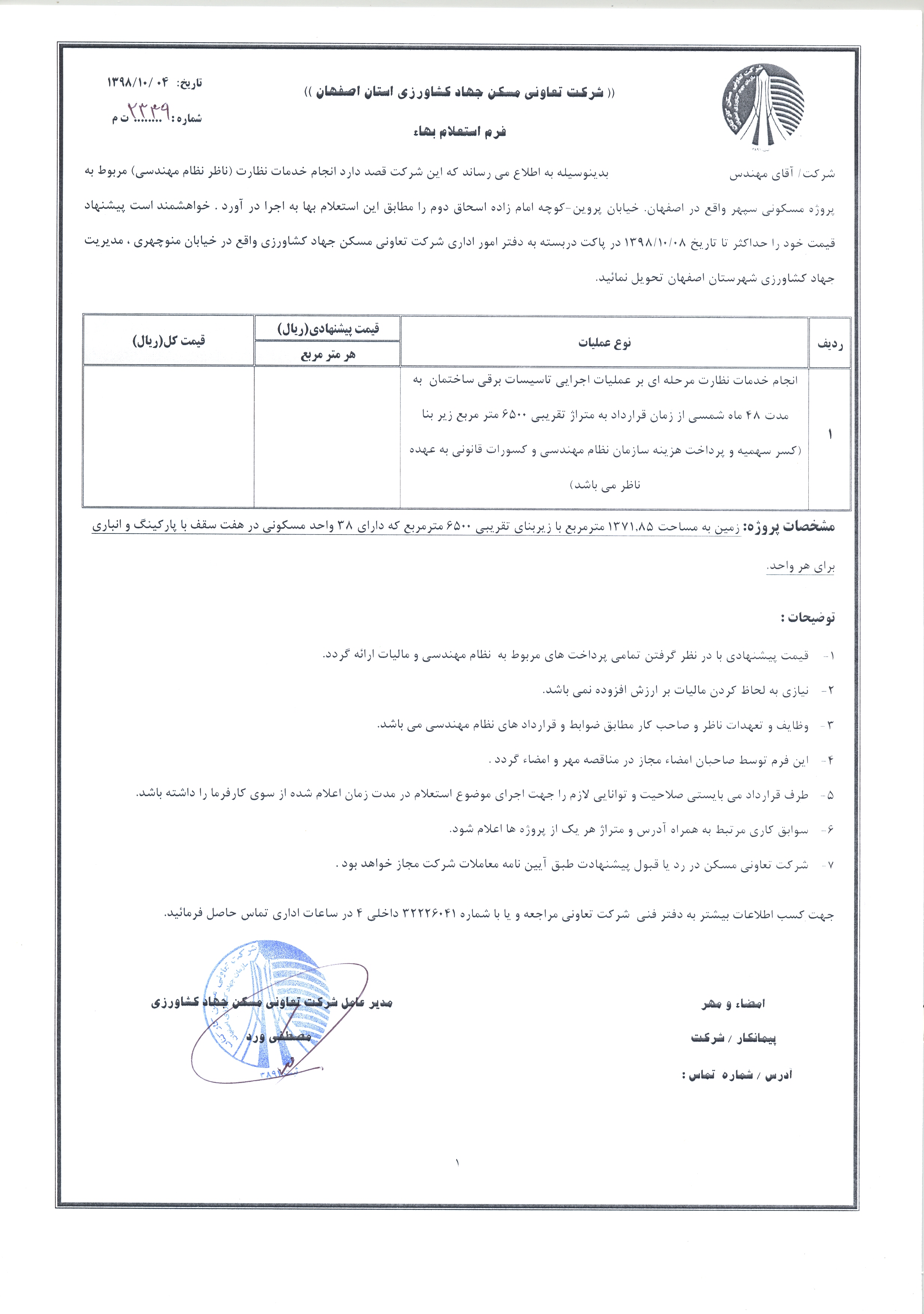 استعلام خدمات نظارت (ناظر نظام مهندسی) پروژه مسکونی سپهر