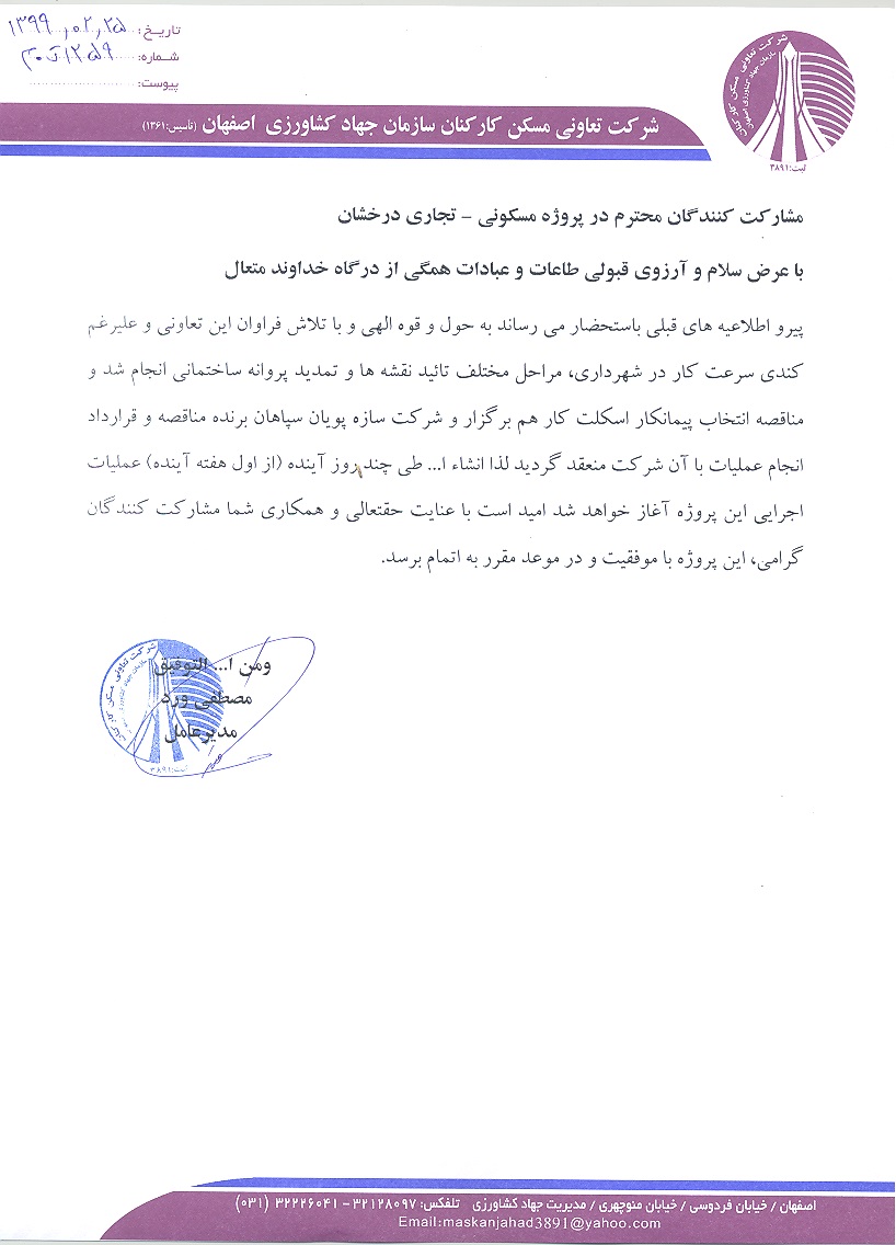 اطلاعیه اعلام برنده مناقصه اسکلت بتنی پروژه مسکونی درخشان