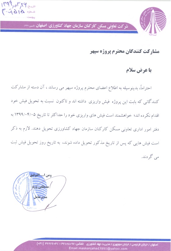 اطلاعیه تحویل فیش واریزی پروژه سپهر