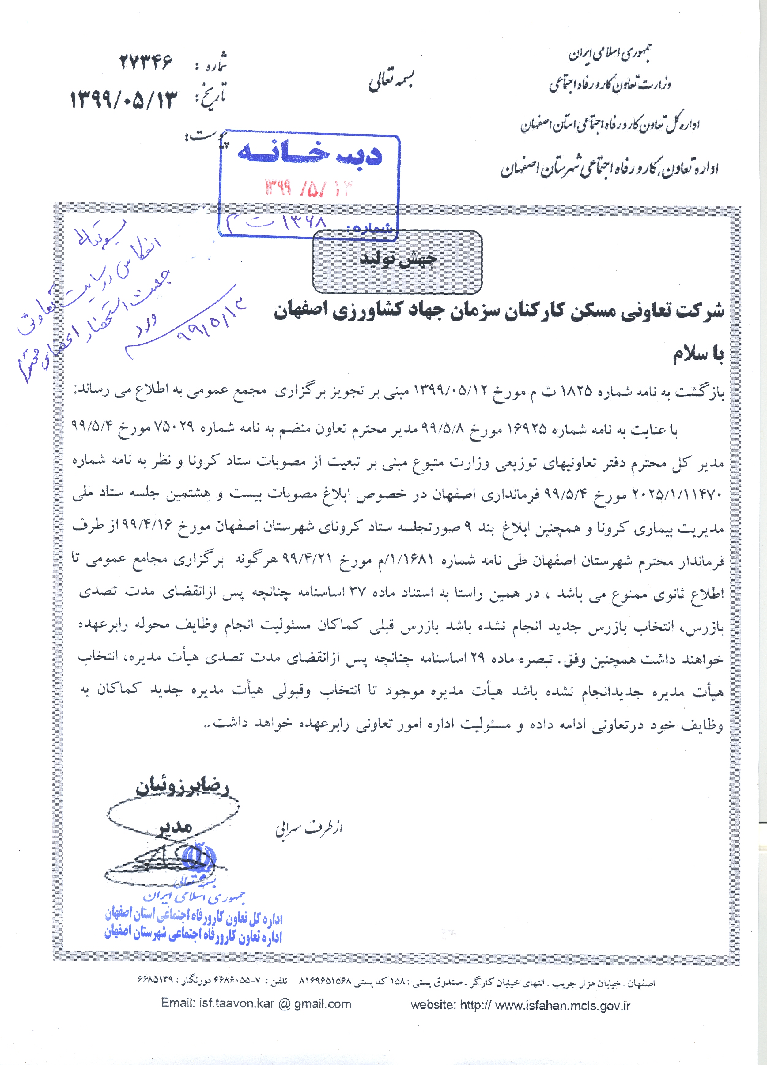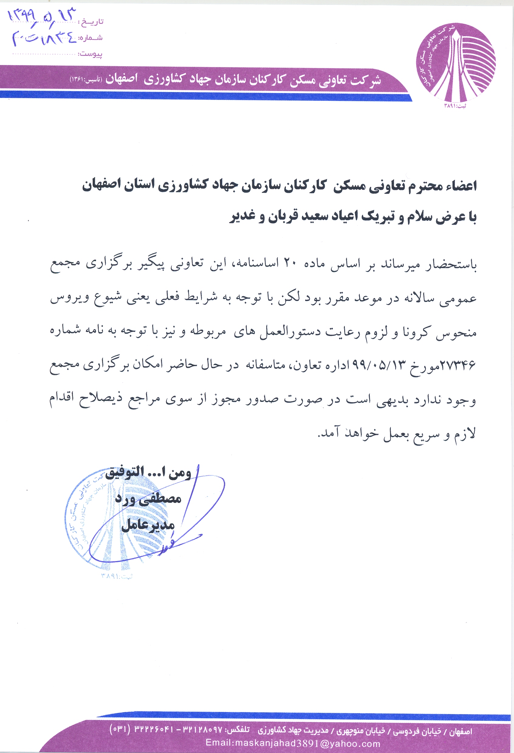 اطلاعیه در خصوص مجمع سالیانه شرکت تعاونی مسکن