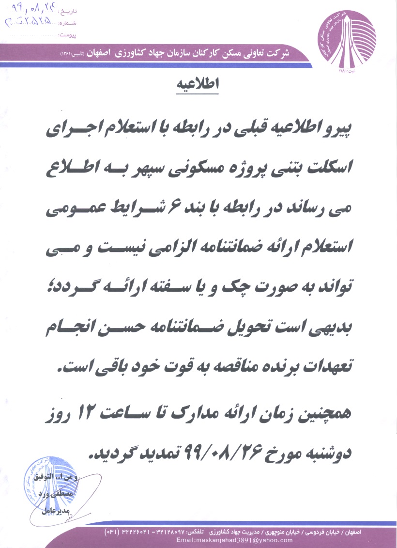 تمدید مجدد مناقصه اسکلت بتنی پروژه مسکونی سپهر