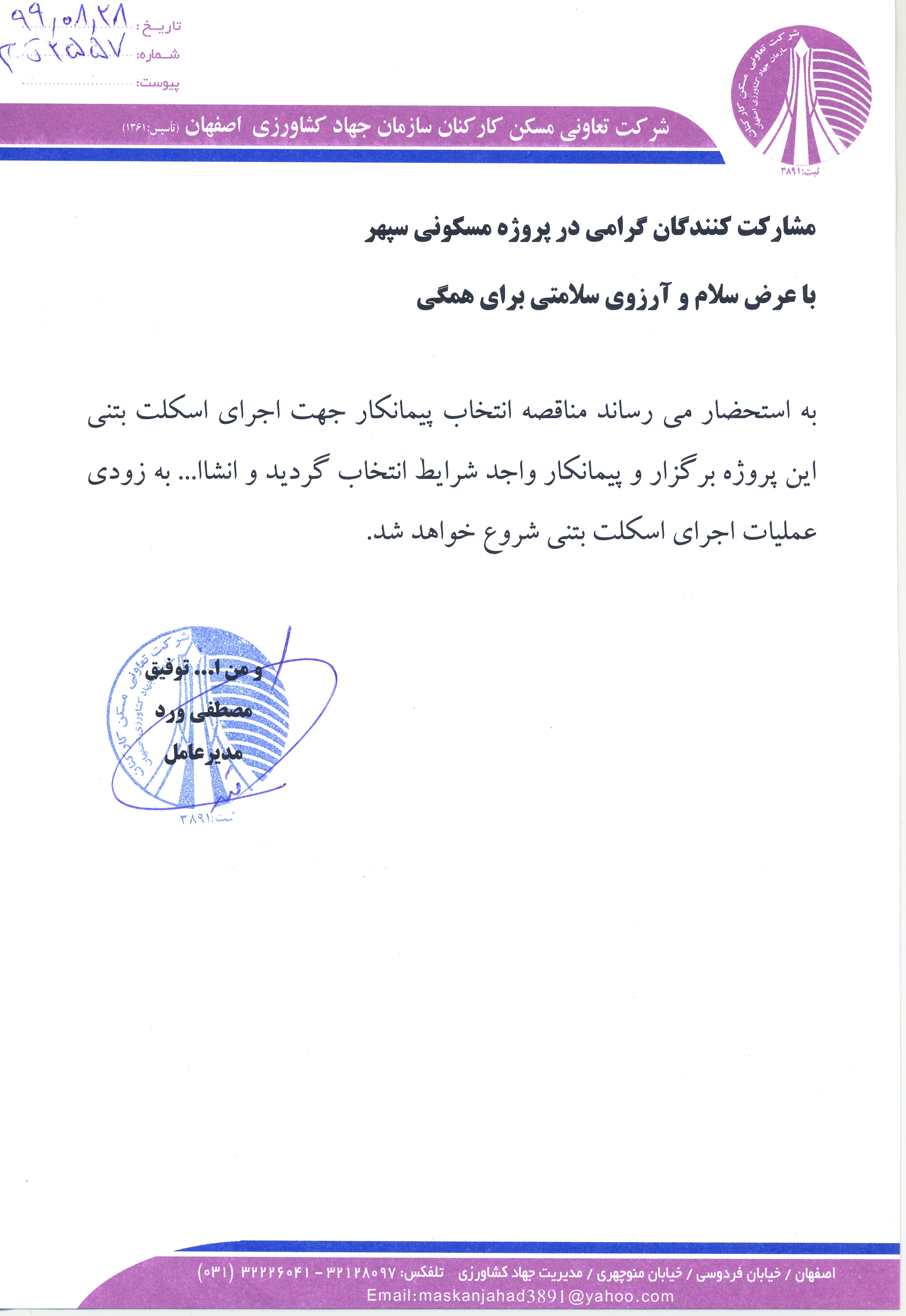 اطلاعیه اعلام انتخاب پیمانکار اسکلت بتنی پروژه مسکونی سپهر