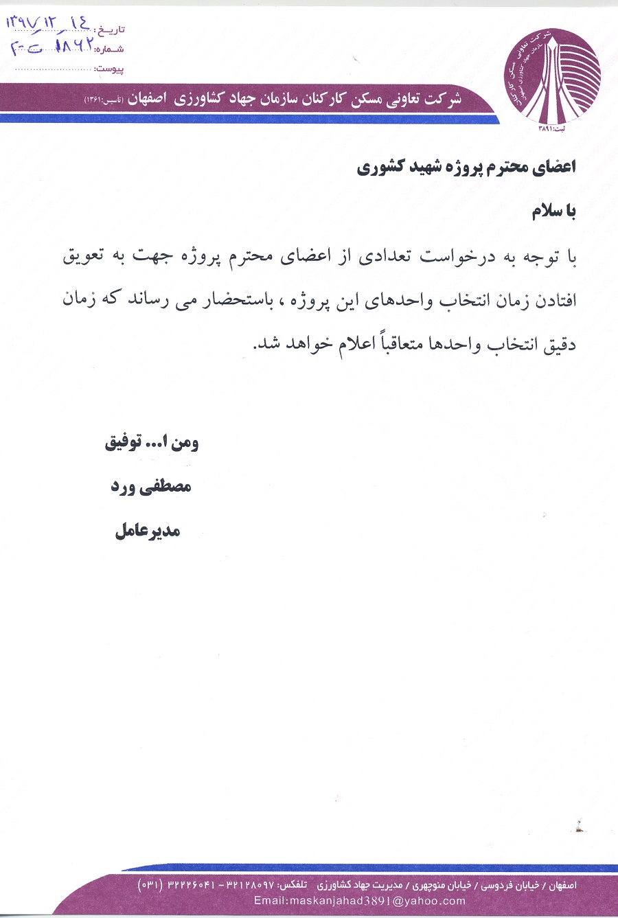 اطلاعیه پروژه مسکونی شهید کشوری -مینو