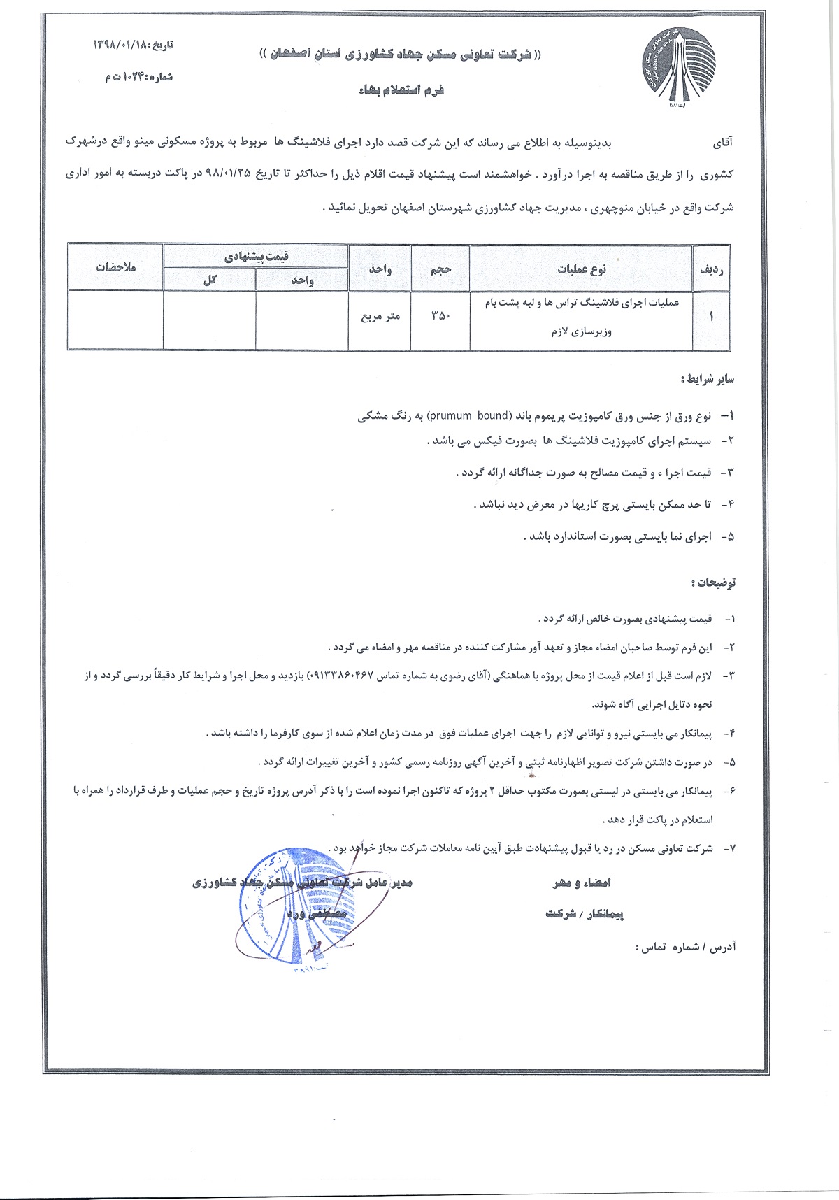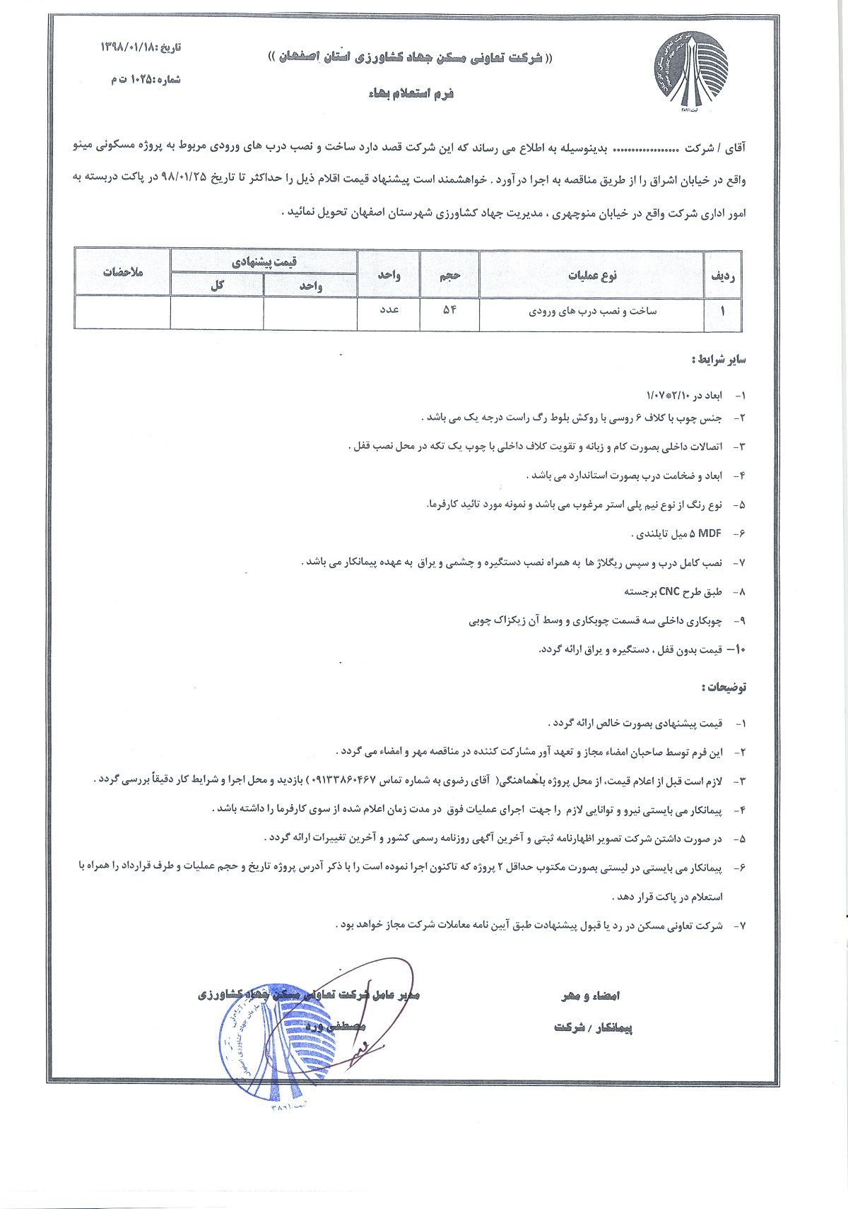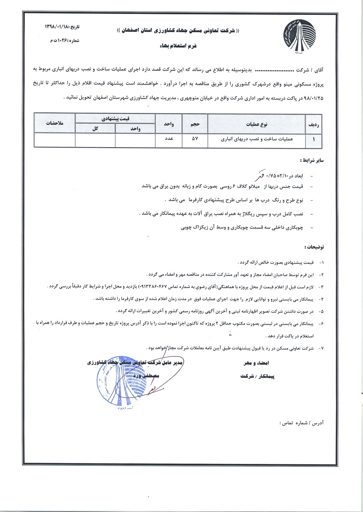 استعلام ساخت و نصب درب ورودی و درب انباری و اجرای فلاشینگ تراس پروژه مسکونی مینو (شهید کشوری )