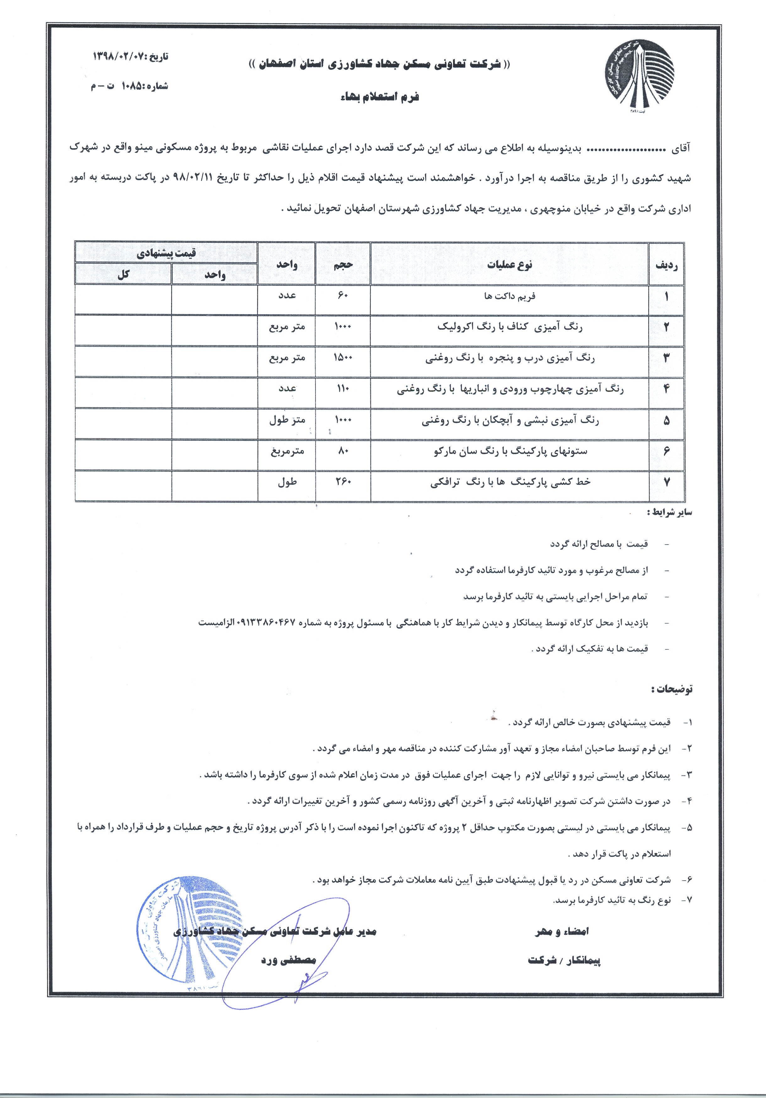 استعلام عملیات اجرای نقاشی پروژه مینو (شهید کشوری )
