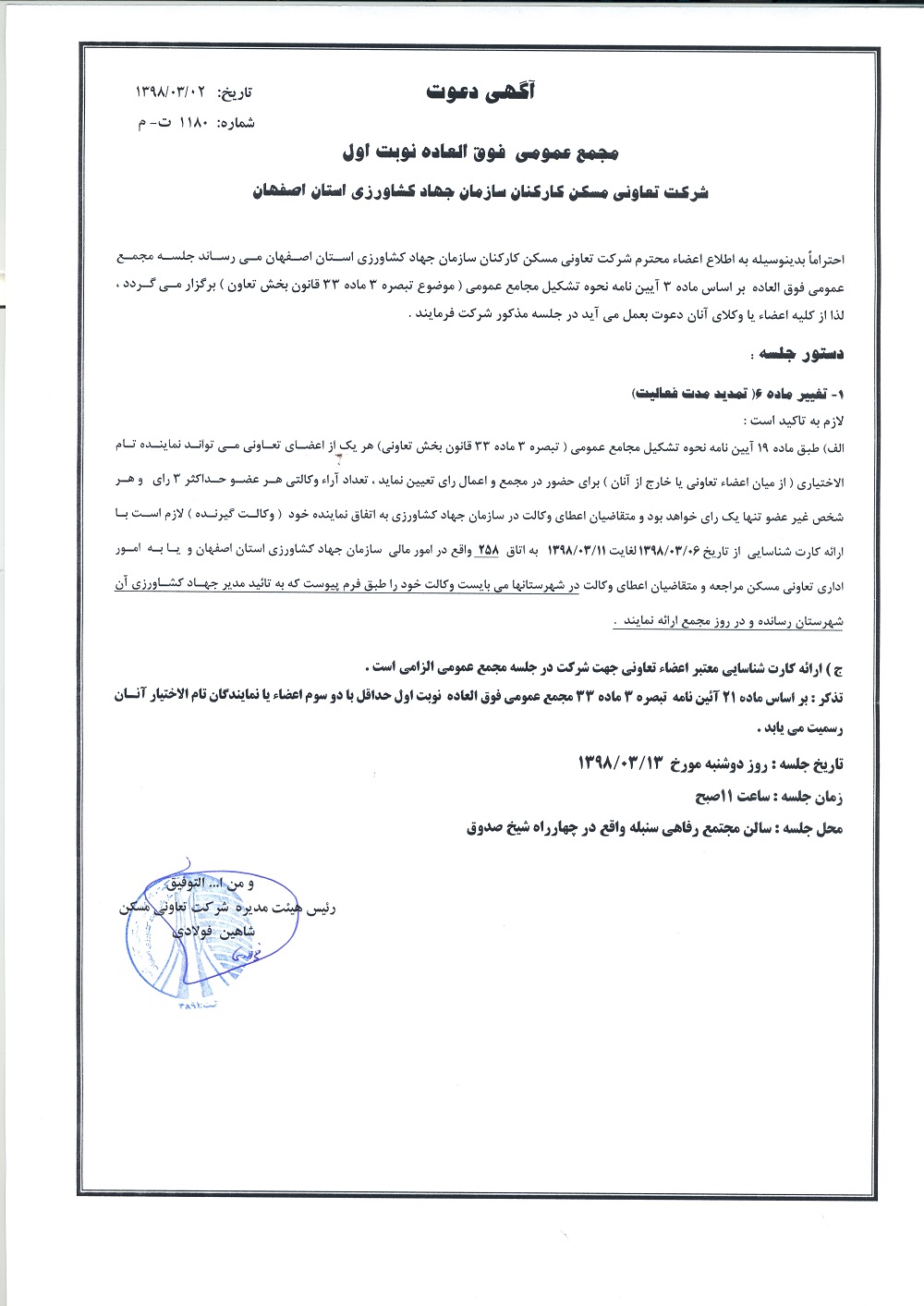 آگهی دعوت مجمع عمومی عادی سالیانه و مجمع فوق العاده شرکت تعاونی مسکن کارکنان جهاد کشاورزی استان اصفهان