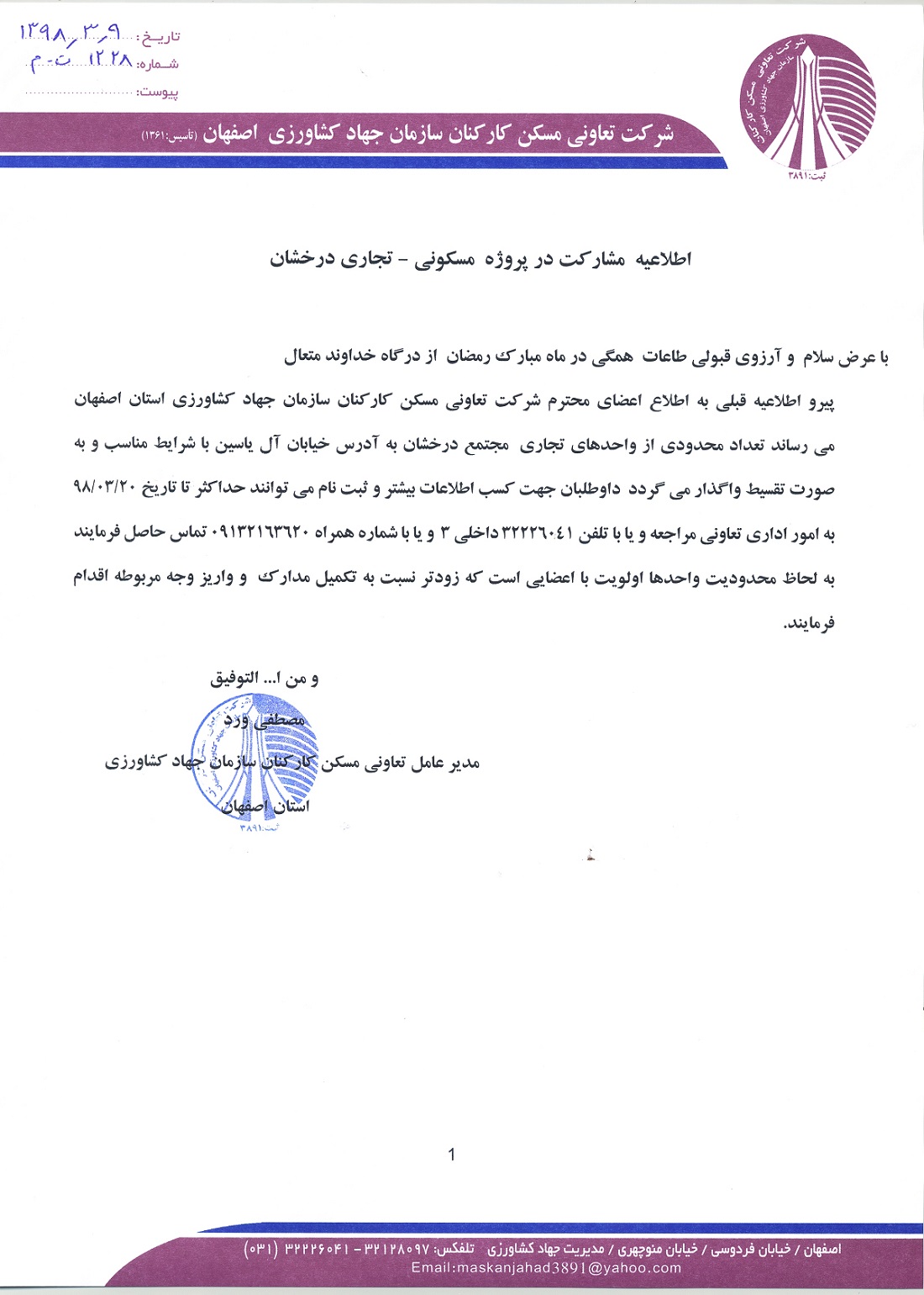 اطلاعیه مشارکت در پروژه مسکونی - تجاری درخشان