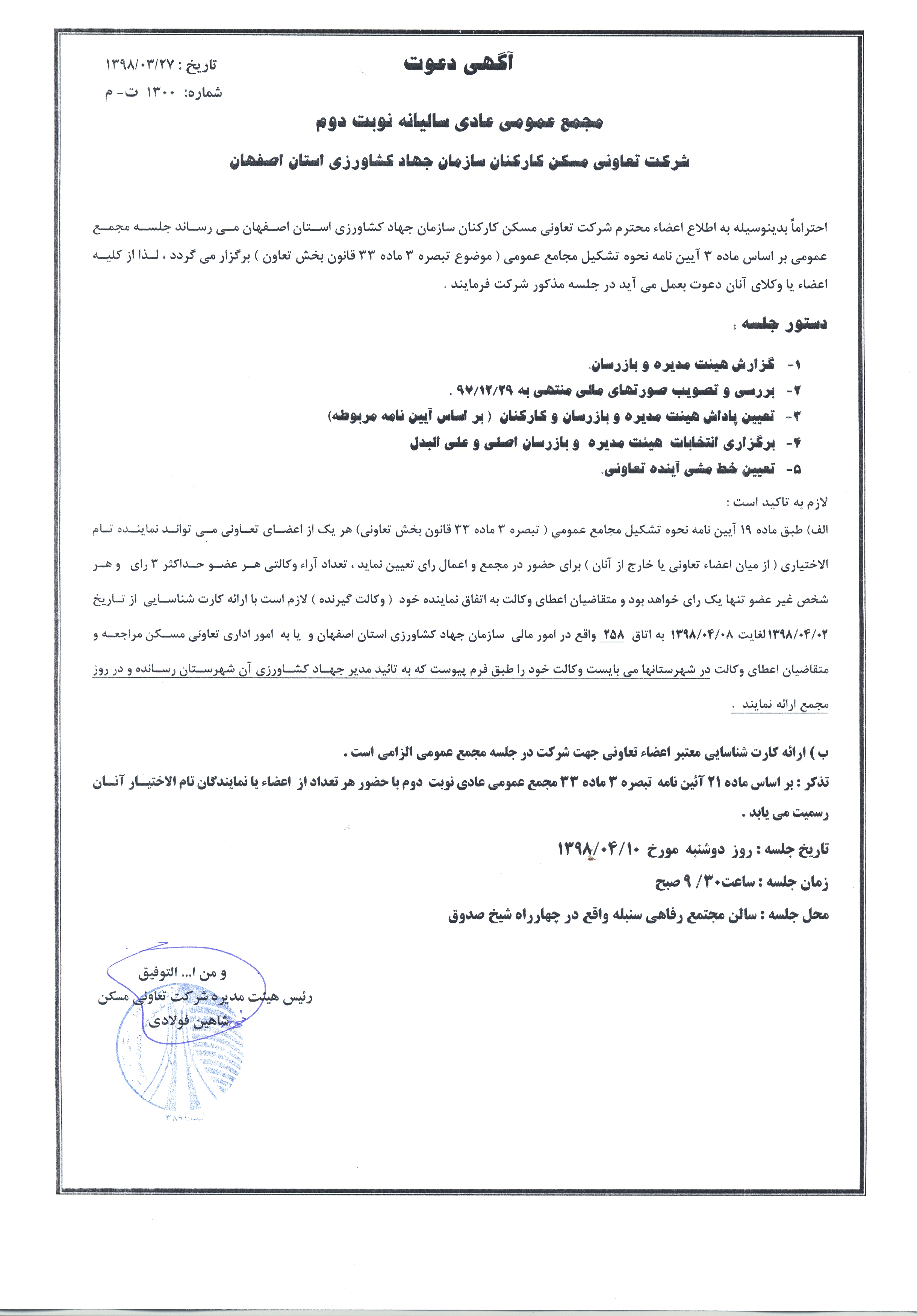 آگهی دعوت مجمع عمومی عادی سالیانه نوبت دوم شرکت تعاونی مسکن کارکنان سازمان جهادکشاورزی استان اصفهان
