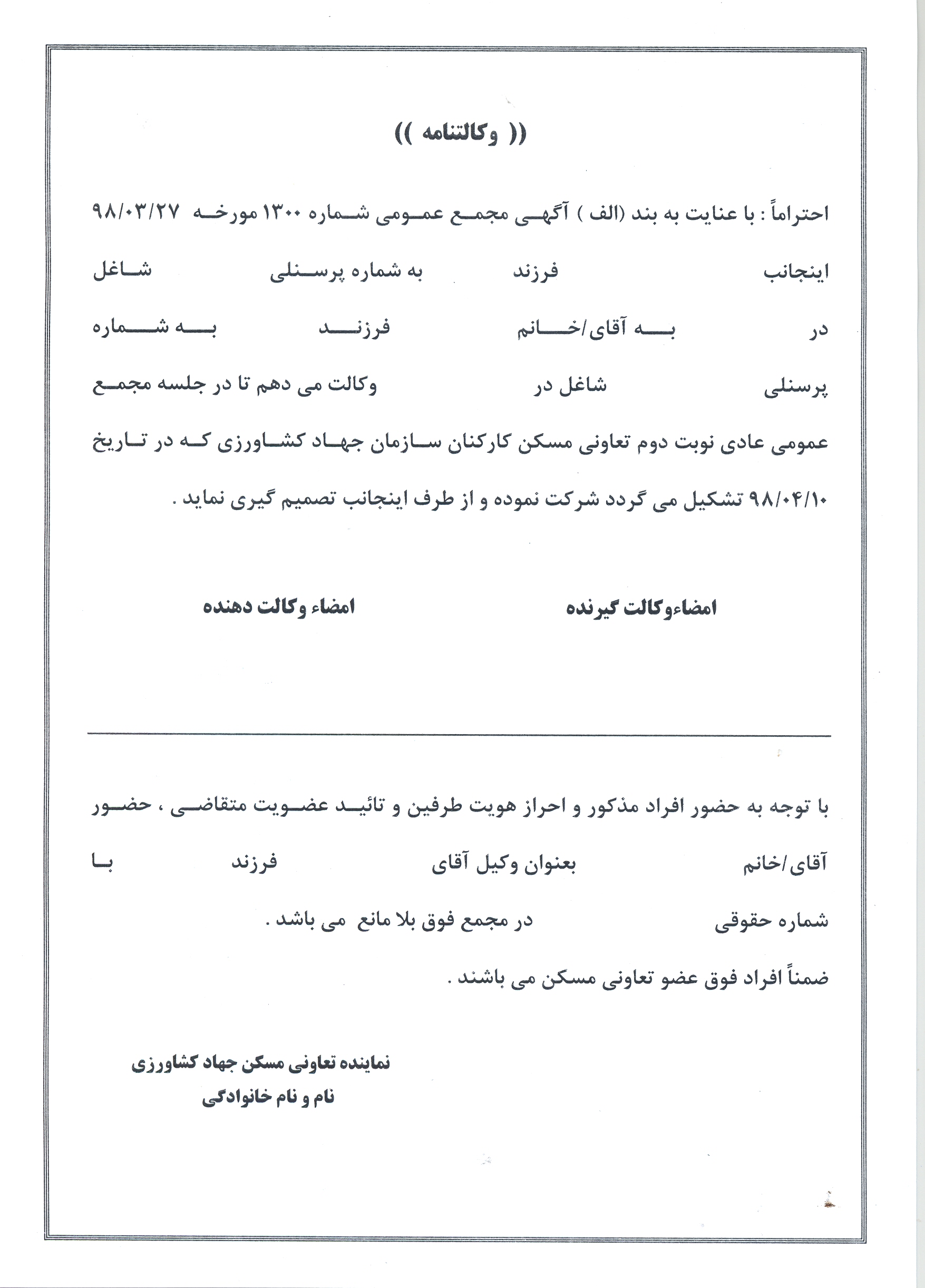 فرم وکالتنامه مجمع عمومی عادی مورخ 1398/04/10