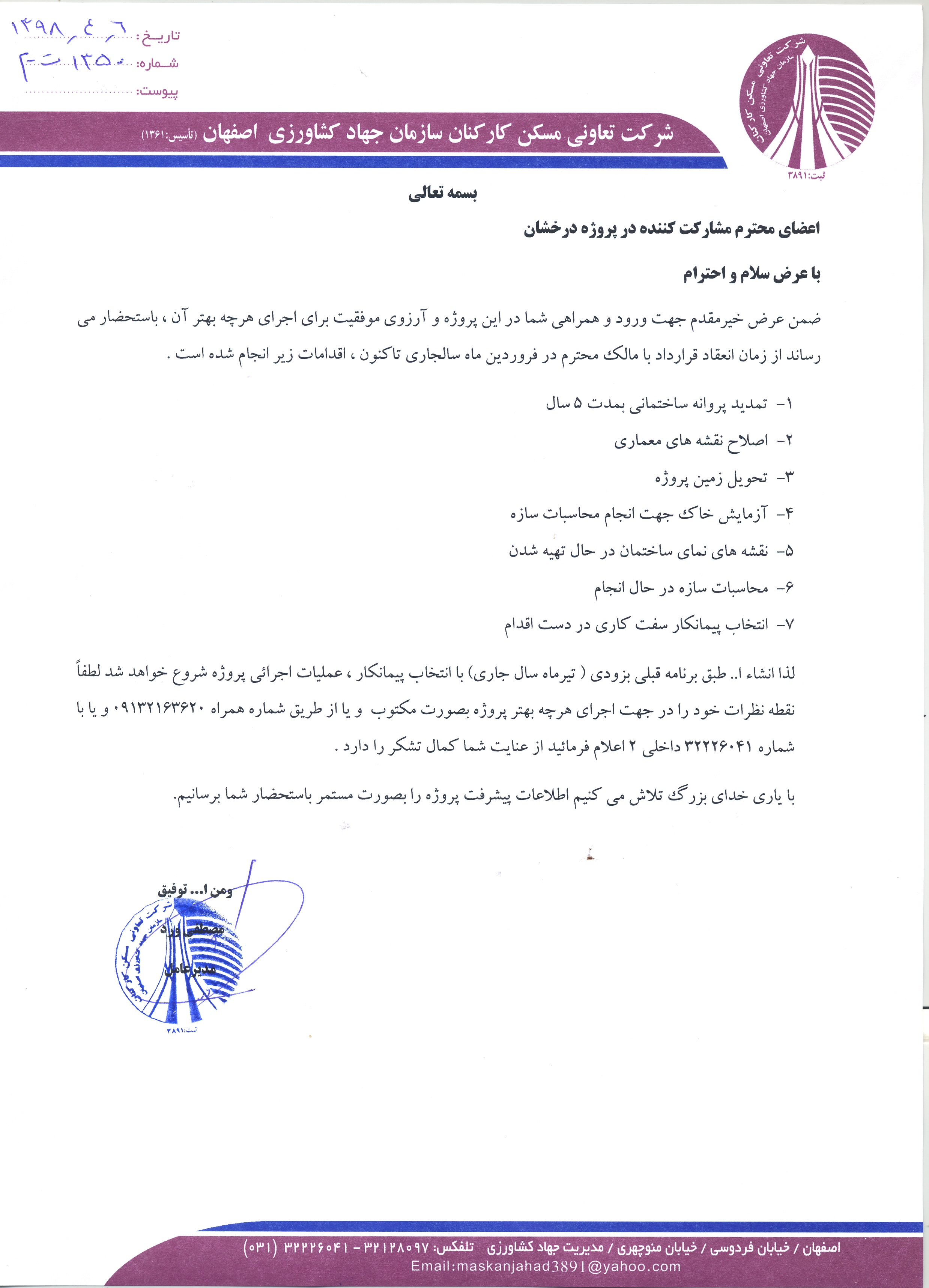 اطلاعیه اعضای مشارکت کننده در پروژه مسکونی درخشان