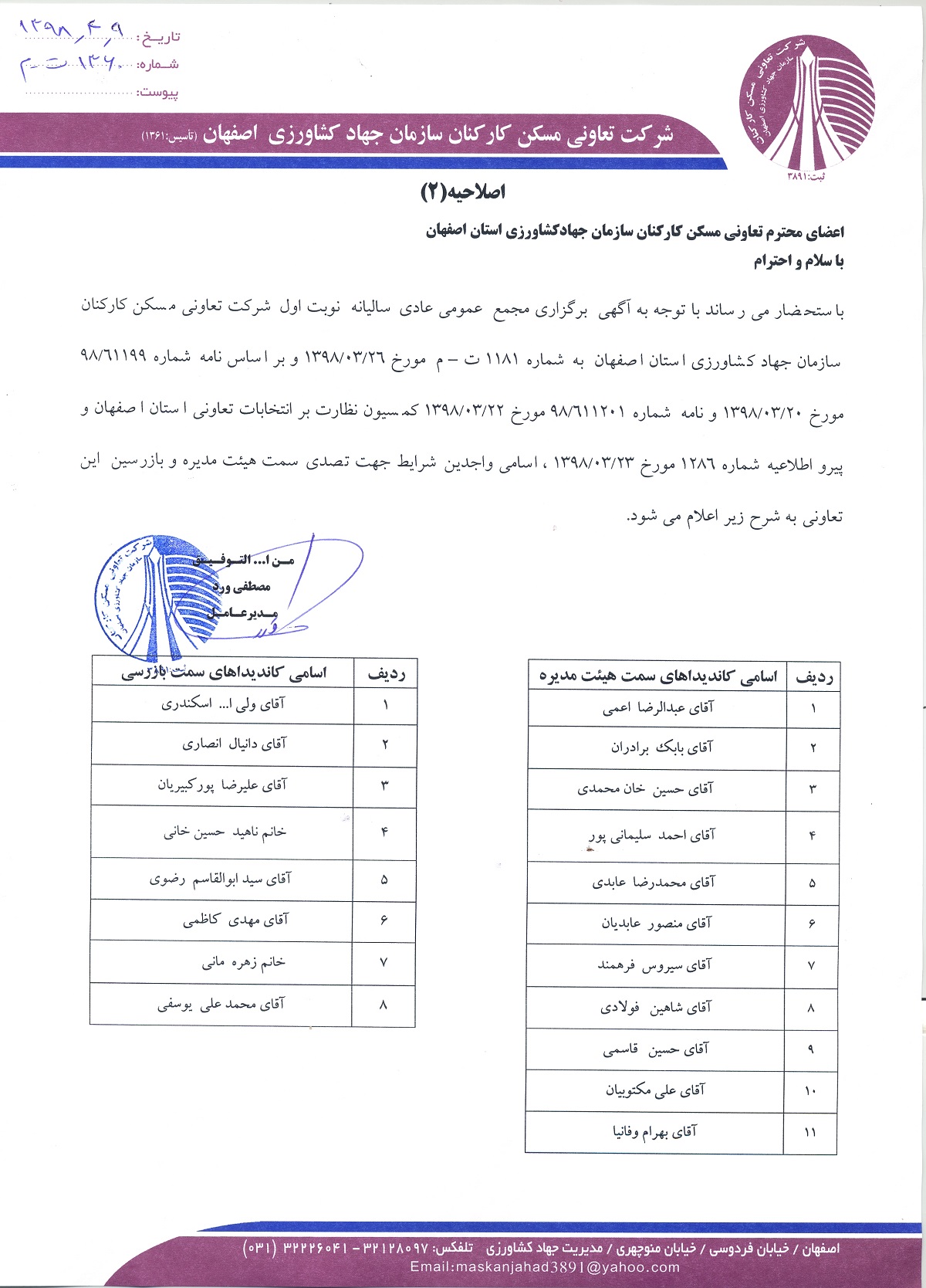اصلاحیه اطلاعیه اسامی کاندیداهای سمت هیئت مدیره و بازرسی شرکت تعاونی مسکن جهاد کشاورزی
